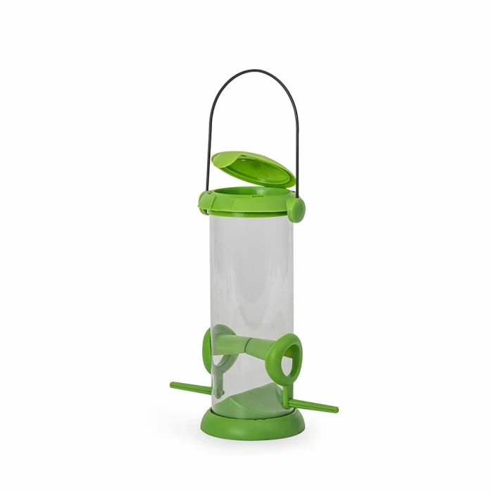 Seed mixes are a firm favourite among a variety of birds and can be offered all year round. This recyclable plastic feeder is the perfect size for little hands to carry and easy to open. Simply fill the feeder with high-quality seeds, click the lid back on and hang it in your garden close to trees or shrubs, to give birds some protective cover. Keep an eye on the feeder to see which birds stop by!